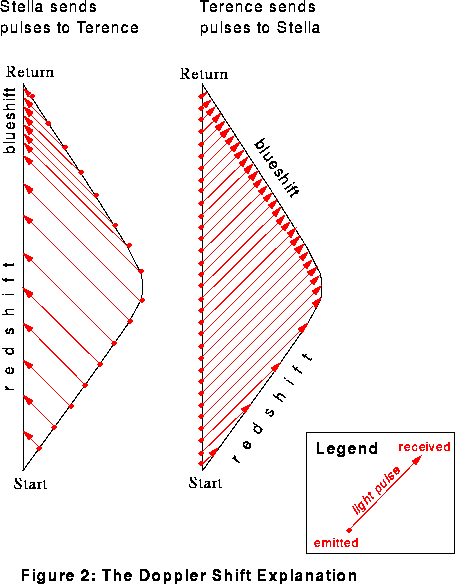 The time dilation factor in the diagram is two: Terence ages twice as much as Stella. (Notice that Stella has time to send off a mere 16 pulses, while Terence fires off 32.) The emissions are spaced evenly from the viewpoint of the respective senders; not so the receptions, which are redshifted or blueshifted according to the relative motion of sender and receiver. All pulses are properly accounted for; check out the Doppler Shift Explanation for full details.
